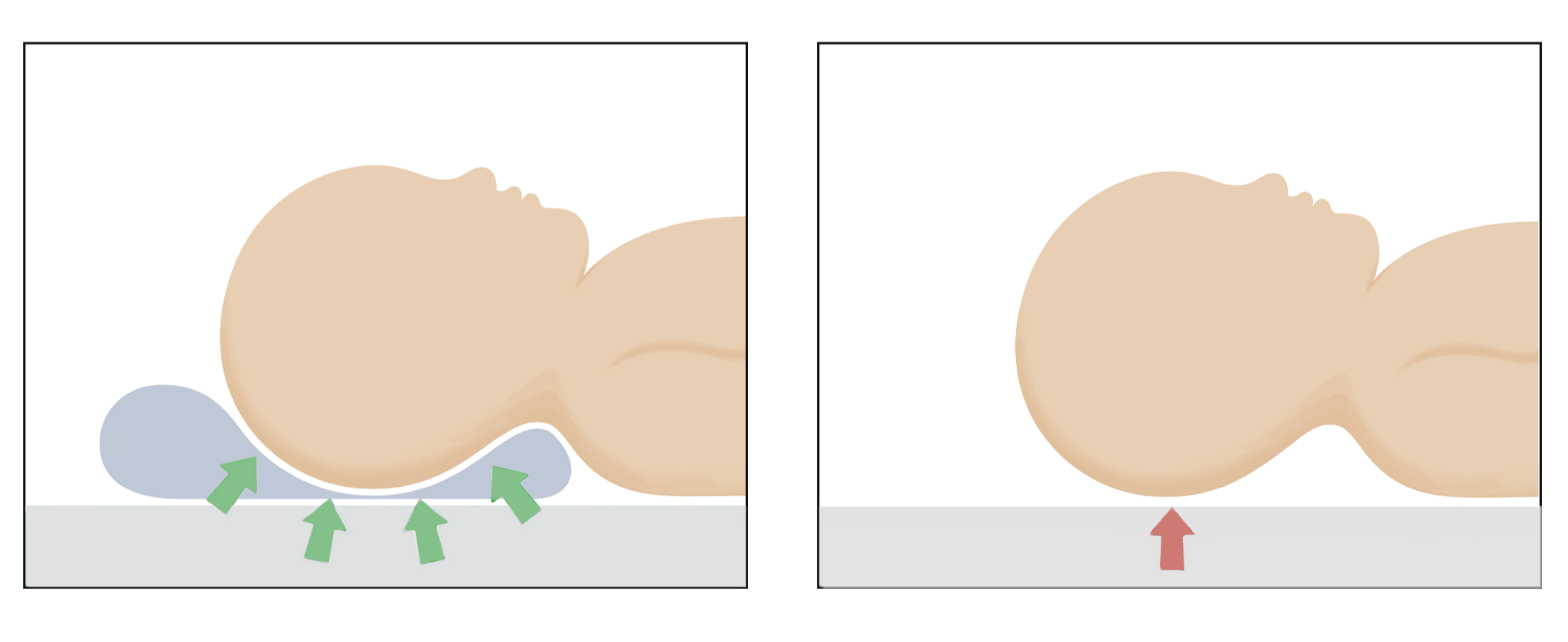 Cojín Mimos® logra distribuir el peso de la cabeza del bebé en una superficie más amplia y evitar que éste se concentre únicamente sobre la zona de contacto